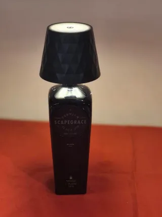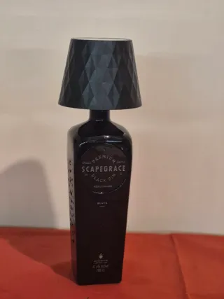 Lampada dal design unico, ispirata a una bottiglia di gin Scapegrace. - Base in vetro lucido. - Paralume nero con texture geometrica.