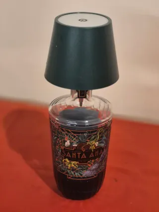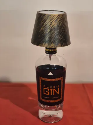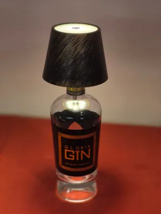 Lampada originale a forma di bottiglia di gin, un pezzo d'arredo che unisce stile e originalità. - Design unico che richiama una bottiglia di gin. - Dettagli in oro e nero. - Realizzata in vetro e plastica.