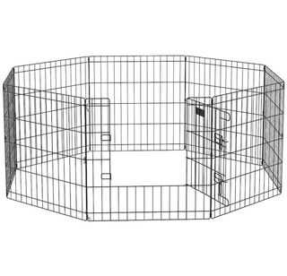 Questo recinto è realizzato con filo resistente e un rivestimento nero antiruggine per una lunga durata. Facile da montare, basta collegare i pannelli tra loro senza bisogno di strumenti. La forma può essere modificata liberamente in ottagonale, quadrata, rettangolare, ecc. Include una porta su uno dei pannelli per entrare e uscire comodamente. La porta ha una serratura per garantire la massima sicurezza per i tuoi cani. MISURE TOTALI: ogni pannello misura 61x61 cm (LxA). Dimensioni della porta: 38,3x46 cm (AxL). Distanza tra le sbarre verticali: 4 cm. Include 8 chiodi da terra per fissarlo al suolo se lo installi in giardino. REF: D06-019V01BK