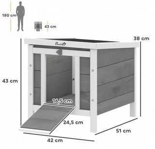 Casetta in legno per animali, ideale per cani o gatti di piccola taglia. Ha un ingresso con porta a ribalta. Design rustico e resistente, tetto rimovibile, facile da montare, sia per interni che per esterni.