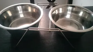 Set di due ciotole per cibo e acqua per animali domestici, presentate su un pratico supporto. Design moderno e funzionale. Facile da pulire. In acciaio inossidabile. MISURE: 16 cm di bocca e 6 cm di altezza.