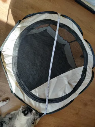 Pratico recinto pieghevole per animali domestici e cuccioli, ideale per mantenere il tuo animale al sicuro e comodo. Design pieghevole per facile conservazione e trasporto. Pannelli in rete per ventilazione. Cerniere per accesso sicuro. Foto con le misure aperte e piegate. Presenta due piccoli difetti, uno nella rete e l'altro su un lato, entrambi possono essere cuciti.