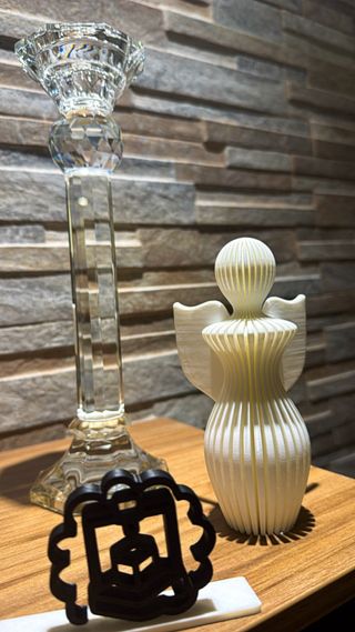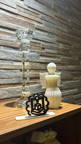 Set di decorazioni natalizie composto da un albero bianco e un elemento nero. - Albero di Natale stilizzato in materiale bianco. - Elemento decorativo nero con dettagli geometrici.