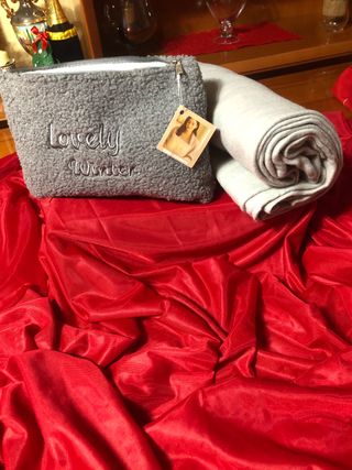 Morbido plaid grigio abbinato a una pochette coordinata. - Pochette in tessuto pelliccia, interamente foderata con zip che misura 30 cmx 18 cm - Plaid arrotolato che misura cm 160x115 disponibile anche nella tonalità beige chiaro