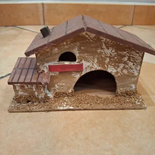 Elemento decorativo per presepe, realizzato con materiali naturali. - Base in sughero. - Dettagli in legno. - Tetto marrone con tegole. - Finestra rossa. - Camino scuro.