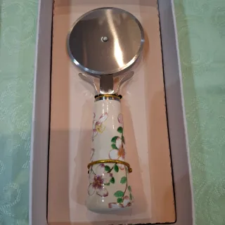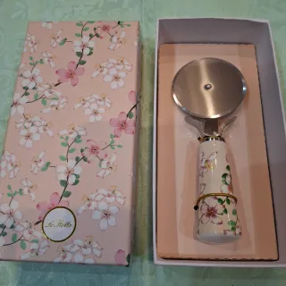 Rotella taglia pizza con un elegante manico in ceramica decorato con fiori. - Lama in metallo. - Manico in ceramica con decorazioni floreali.