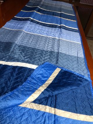 Copriletto trapuntato per letto singolo, con un design a righe e rombi nei toni dell'azzurro e del blu. - Fantasia Le fantasié di Camille Barrarez. - Tessuto stampato.