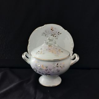 Elegante set composto da un piatto e un portacioccolatini in porcellana francese di Limoges, decorato a mano dai "maestri artigianali" , impreziosito da dettagli dorati e un delicato motivo floreale. - Design raffinato con finiture oro. - Motivo floreale stilizzato su base bianca. Misure come in foto. Il set si trova in ottime condizioni, nessun danno o altro. IL PREZZO INSERITO E' RIFERITO PER L'INTERO SET, QUALORA FOSTE INTERESSATI POSSO VENDERLO ANCHE SINGOLARMENTE CON I SEGUENTI PREZZI: - PIATTO € 25,00 - PORTACIOCCOLATINI CON COPERCHIO € 30,00