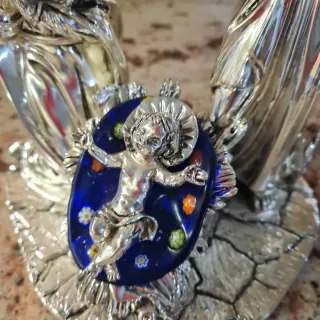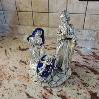 Vendo raffinato presepe artistico in argento placcato con inserti originali in vetro di Murano. Il set è composto da Maria, Giuseppe e il Bambin Gesù nella culla, tutti realizzati con lavorazione dettagliata e finiture di qualità. Gli inserti in autentico vetro di Murano, presenti sul mantello di Maria , sulla culla e cintura di Giuseppe, donano alla scena un effetto luminoso e prezioso, rendendo il pezzo unico e altamente decorativo. La base riproduce un effetto pietra scolpita, stabile e ben rifinita. Condizioni eccellenti, senza segni di usura. Dimensioni: circa 22–18 cm