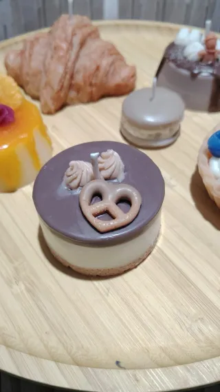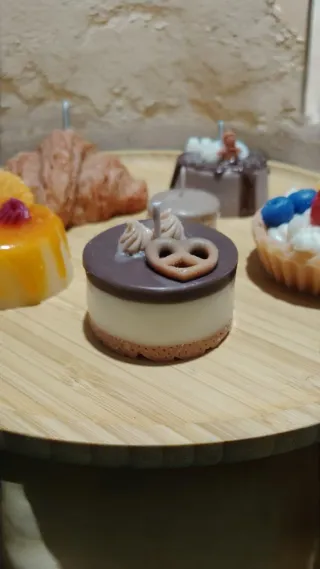 Set di candele decorative che riproducono un croissant e una crostatina alla frutta. - Candela a forma di croissant 7€, può essere anche decorato per ricordare un cornetto al cioccolato o alla frutta - Candela a forma di crostatina con decorazioni di frutta e panna 6€.