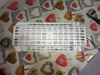 Accessorio Moulinex per julienne e affettare. - Accessorio in plastica bianca. - Disco in metallo con fori per julienne. - Tappo rosso. - Manico in metallo.
