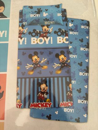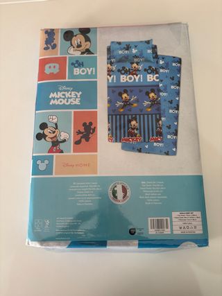 Set completo letto singolo con il simpatico Topolino Disney. Perfetto per la cameretta dei più piccoli. - Lenzuolo superiore 150x280 cm. - Lenzuolo con angoli 90x200+20 cm. - Federa 52x82 cm. - 100% cotone