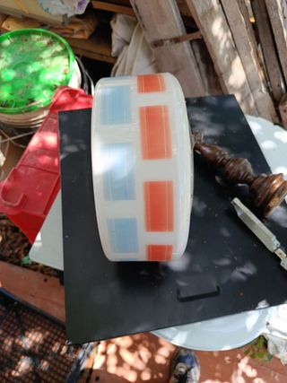 Bellissimo lampadario vintage, ideale per un arredamento retrò. - Struttura in metallo e vetro. - Motivo a righe rosse e bianche. - Perfetto per aggiungere un tocco di charme alla tua casa.