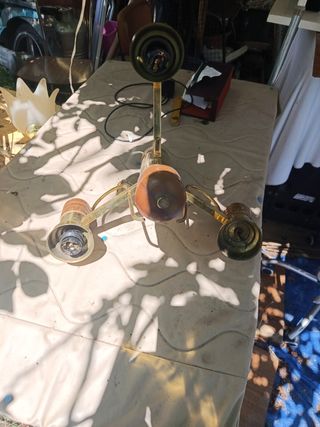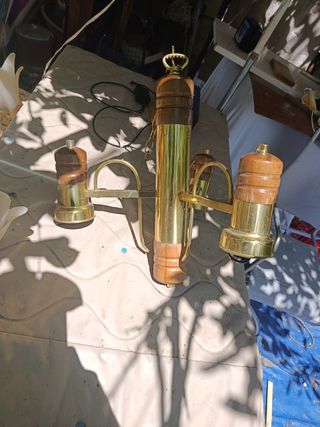 Bellissimo lampadario vintage, ideale per un ambiente retrò. - Struttura in metallo color oro e legno marrone. - Tre punti luce. - Design elegante e raffinato da restauro o per progetti manca un attacco e 2 fermi da ripulire un po esternamente legno con qualche creatura ma nulla di grave