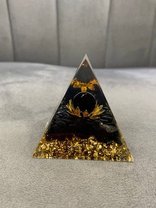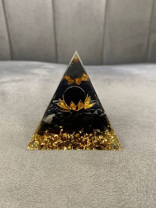 Bellissima piramide di Orgonite con Ossidiana Nera e un delicato fiore di loto dorato al centro. La base è arricchita da pagliuzze dorate che creano un effetto luminoso. - Elemento decorativo unico. - Design ispirato alla natura. Utilizzate per meditazione, benessere e riequilibrio degli ambienti, si posizionano spesso a nord o vicino a fonti elettromagnetiche Dimensioni approssimative: 6 cm Peso approssimativo: 100gr