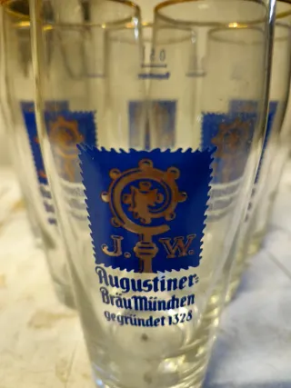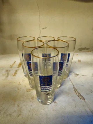 Questo è un set di bicchieri da birra ufficiali del birrificio Augustiner-Bräu München. Sei bicchieri 0,5 cl "pinta". presentano un bordo dorato e sono realizzati in vetro. Non rotti ne scheggiati.