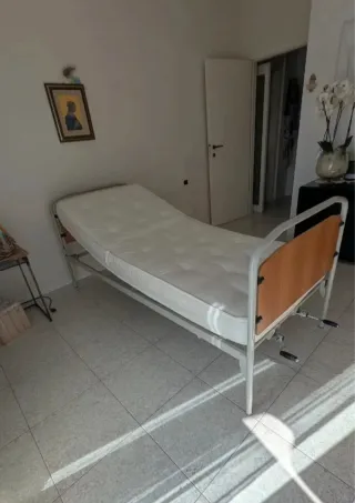 Manuale con due manovelle. Disponibile da subito. Solo zona Rimini. Larghezza esterna cm 90 Lunghezza esterna cm 206 Lunghezza rete cm 200 Altezza testate cm 48 Altezza rete da terra cm 45 Portata massimo carico Kg 170 Peso Kg 37 Struttura in profilati d'acciaio, rete con tre articolazioni. Completo di materasso a molle 87x195 h 5 e sponde. Disponibile da subito.