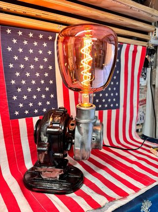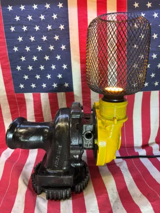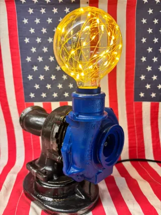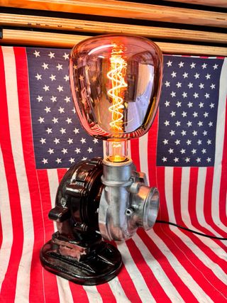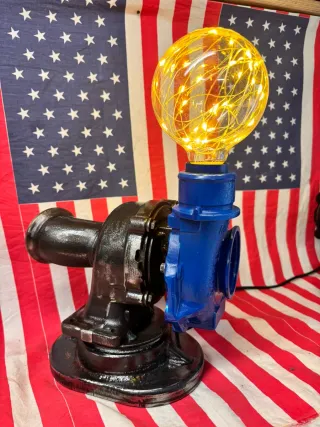 Lampada dal design unico che unisce elementi industriali e un tocco moderno. Perfetta per chi ama uno stile audace. - Base in metallo verniciato nero. - realizzata utilizzando vero turbo auto - Lampadina a globo con fili luminosi inclusa.