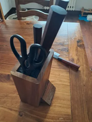 Elegante ceppo porta coltelli realizzato in legno di Acacia. Un accessorio funzionale e di design per la tua cucina. - Materiale: Legno di Acacia. - Colore: Marrone e nero.
