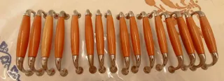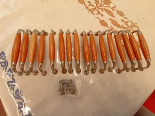 Set di venti maniglie per ante cucina in legno chiaro e metallo con relative viti di fissaggio. Passo 13.