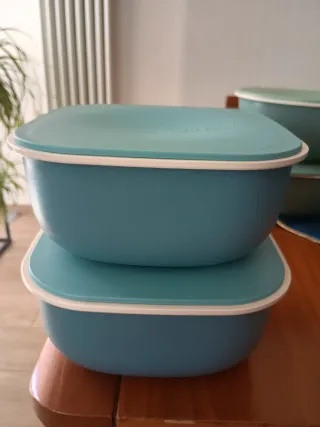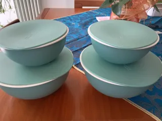 Set di vari contenitori per alimenti Guzzini, ideali per conservare il cibo. - Colore verde acqua e grigio - Realizzati in plastica resistente.