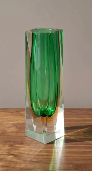Splendido vaso in vetro sommerso, un pezzo unico che cattura la luce. - Design iconico di Murano. - Combinazione di colori verde intenso e ambra. - Base trasparente sfaccettata.
