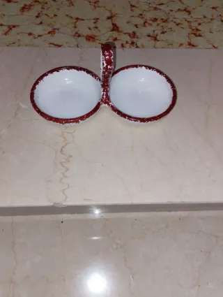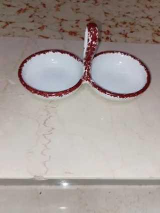Elegante piatto doppio in ceramica, perfetto per servire due pietanze separate. -Ideale x Salse/Olive - Design a due vaschette. - Bordo decorativo rosso.