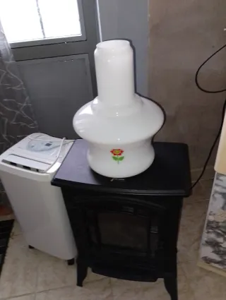 Lampadario vintage in stile anni '60, con un design unico. -Corpo unico - Parte superiore in vetro arancione. - Base in vetro bianco con decorazioni verdi. - Cavo elettrico con condensatore incluso.