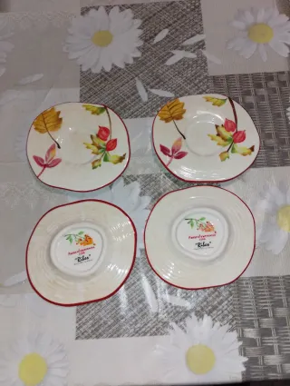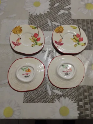 Set di 4 piattini della linea Ribes di Andrea Fontebasso, con un decoro autunnale di foglie e bacche. - Design floreale e colorato. - Bordo rosso. - Ideali per tazze da tè o caffè.