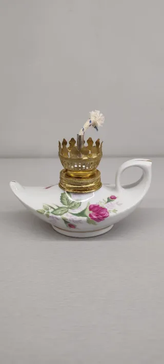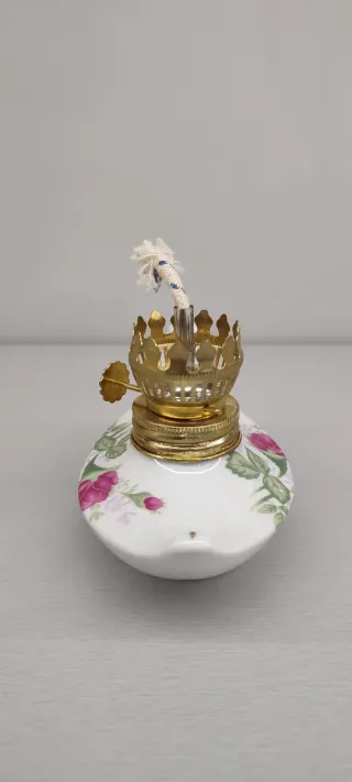 Deliziosa lampada a olio in porcellana bianca, impreziosita da una vivace decorazione floreale con rose rosa e foglie verdi. Manico laterale misura 12 x 7 cm e 8 cm di altezza. Funzionante. - Decorazione floreale con rose. - Meccanismo superiore in metallo.