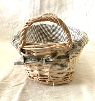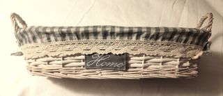 Cestino rettangolare in vimini intrecciato con rivestimento interno in tessuto a quadretti grigio e bianco, completo di manici laterali e dettagli decorativi in pizzo e fiocco. Ideale come portapane, cestino da tavola o contenitore decorativo per cucina e casa in stile shabby chic, country o provenzale. Dimensioni 40 × 20 × 9 cm Condizioni Praticamente nuovo. Non presenta segni di usura né difetti: struttura solida, vimini integro e tessuto pulito e in ottimo stato. Usato pochissimo o mai utilizzato. Venduto come da foto.