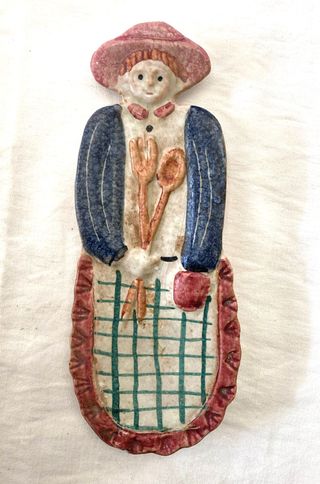 Appoggiacucchiai in ceramica italiana della metà del Novecento, realizzato e decorato a mano. La forma è quella di una figura femminile stilizzata, con grembiule decorato a griglia verde e piccoli utensili da cucina in rilievo sul busto, in un delizioso stile naïf tipico della produzione popolare italiana degli anni ’50–’60. Sul retro è presente la scritta “ITALY”, e nella parte superiore si trova un piccolo foro che permette di appenderlo a parete, rendendolo non solo funzionale ma anche decorativo. Può essere utilizzato come appoggiacucchiai oppure esposto in cucina come elemento vintage dal sapore autentico. Dimensioni 23x9.