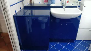 Mobile da bagno con finiture in blu e bianco. - Struttura in legno. - Ante in vetro lucido. Con mobile contenitore per lavatrice Lunghezza: 1,41 Profondità lavandino: 33 Profondità lavatrice:66 Vendita solo a Torino e dintorni con ritiro a carico dell' acquirente
