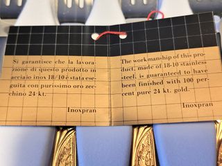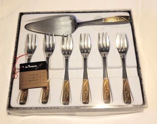 Elegante set di posate da dolce Inoxpran, nuovo e mai utilizzato, completo di scatola originale e certificato di garanzia. Il set comprende 6 forchettine da dolce e 1 paletta coordinata. Realizzato in acciaio inox 18/10 con finitura dorata in oro zecchino 24 kt, come indicato nel certificato. Design classico ed elegante, ideale per dessert, torte e occasioni speciali. Oggetto conservato con cura, perfetto anche come idea regalo o pezzo vintage anni ’80/’90.