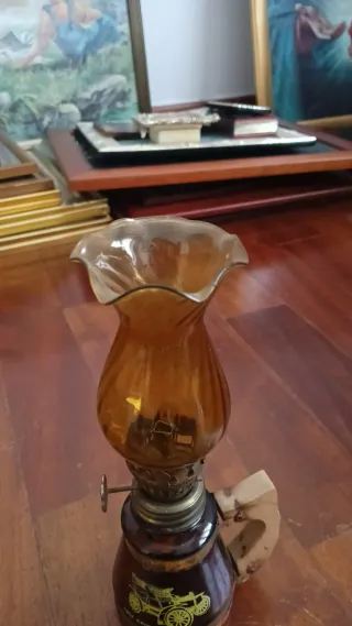 Lampada decorativa in vetro ambra con dettagli dorati e manico in legno. Presenta un'immagine di una Cadillac del 1904. - Materiali: vetro, metallo, legno. - Colore: ambra, oro.