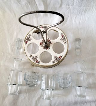 Cestino oliera vintage con base in metallo e manico centrale, completo di vasetti in vetro originali. Il set comprende due bottigliette con tappo e tre contenitori in vetro destinati a sale, pepe e stuzzicadenti. La base è decorata con un delicato motivo floreale in stile classico, tipico dei servizi da tavola d’epoca. Oggetto elegante e funzionale, ideale per una tavola vintage o come elemento decorativo per cucina e credenza. Condizioni molto buone, come da fotografie. Diametro cm. 16, H totale cm. 27