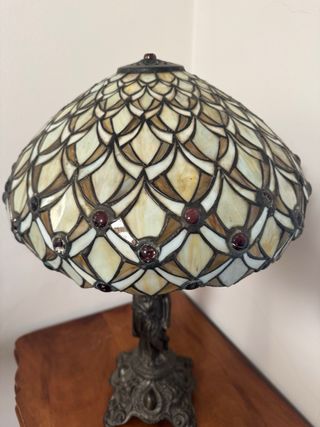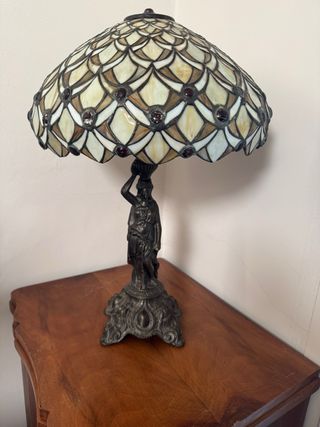 Lampadario in stile Tiffany con base in metallo raffigurante una figura femminile. - Paralume in vetro colorato con motivi a scaglie. - Dettagli in vetro colorato scuro lungo il bordo del paralume. - Base in metallo finemente lavorata.