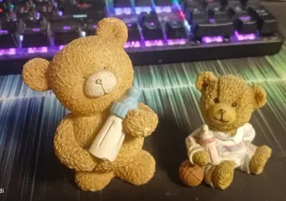Statuette della collezione Cherished Teddies. La collezione è stata introdotta negli Stati Uniti nel 1992 da Enesco, basata sulle illustrazioni di Priscilla Hillman e suo figlio Glenn. Ogni statuetta in resina è dipinta a mano da artisti qualificati. Sono tra le statuette di orsetti di peluche più collezionate di sempre. - Orsetto grande con biberon azzurro. - Orsetto piccolo con biberon rosa e palla.