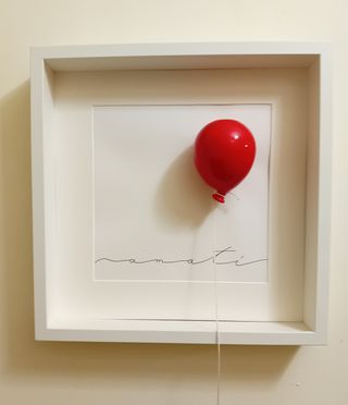 Bellissimo quadro decorativo con un palloncino rosso. - Cornice bianca. - Scritta namaste in corsivo nero.