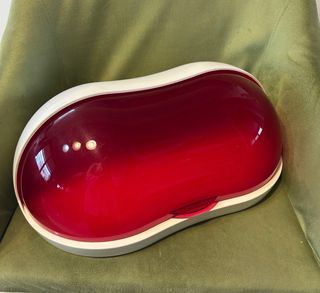 Guzzini Vintage Porta Pane Space Age Design Bruno Gecchelin Anni 80 Bellissimo oggetto caratterizzato da uno stile "space age" o futuristico. È stato disegnato da Bruno Gecchelin negli anni '80 per la serie "Latina" di Guzzini. Ha una base bianca e una calotta superiore basculante in plastica trasparente rossa. Pezzo oltre che funzionale ,un elemento di arredo iconico alla cucina. Si presenta in buono stato, integro solo leggeri possibili segni sulla parte rosso . Misure: 44 x 25 x 18 cm circa