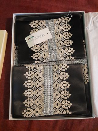 tris centrini utilizzabile sia come centrini che come federe per cuscini da decorazioni, molto eleganti. con scatola. Il grande è 59/60x34cm i piccoli 29x29cm