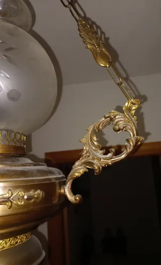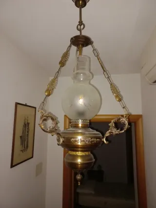 Elegante lampadario a sospensione in ottone, inizio Novecento, con un paralume in vetro smerigliato. • La struttura in ottone presenta decorazioni a volute e motivi fogliacei. • Il paralume in vetro ha una forma a bulbo smerigliato. • Il lampadario è sostenuto da catene che si collegano a un rosone a soffitto. • Il design è classico, con un gusto che ricorda lo stile Impero Dim. globo diam. 18 cm h= 22 cm Altezza totale 75 cm