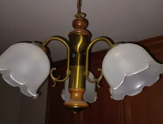 Elegante lampadario a sospensione con tre diffusori luce in vetro. - Struttura in metallo color oro. - Diffusori in vetro bianco. - Dettagli in legno - Design classico e raffinato. - I paralumi in vetro sono a forma di campana (3) in vetro marmorizzato. - Il lampadario è sostenuto da catene che si collegano a un rosone a soffitto. Diam. 17 cm Altezza 70 cm