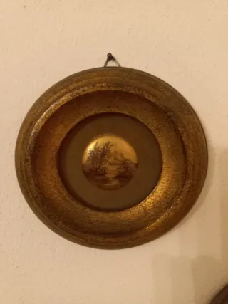 Deliziosa coppia di quadretti rotondi, perfetti per aggiungere un tocco di eleganza alla tua casa. - Cornici in legno con finitura dorata. - Immagini interne con paesaggi. - Diametro di ogni quadretto 14 cm