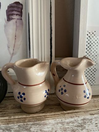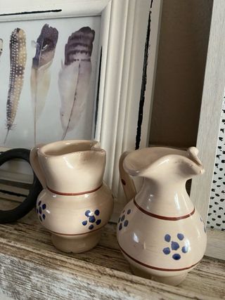Delizioso set di due brocche in ceramica dipinte a mano. Perfette come decorazione o per piccole quantità di liquidi. - Ceramica color crema. - Decorazioni floreali blu. - Bordi e manici con dettagli marroni.