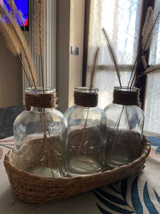Set di tre vasetti decorativi in vetro, perfetti per aggiungere un tocco rustico alla tua casa. - Realizzati in vetro trasparente. - Decorati con corda di juta attorno al collo. - Contengono fibre naturali essiccate per un aspetto boho-chic. - Posizionati su un cestino in paglia intrecciata. Tutto compreso Usato poco Solo esposizione