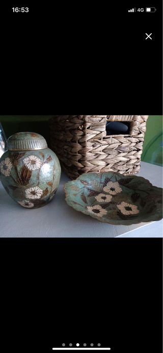 Set composto da un vaso decorativo e una ciotola, entrambi con un motivo floreale. - Vaso con coperchio. - Ciotola a forma di foglia. - Finitura in ottone di colore verde salvia - si può usare su una scrivania come svuota tasche o posacenere o porta caramelle Vintage di ottima fattura