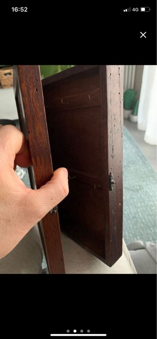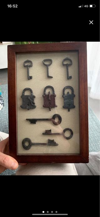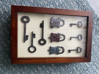 Cornice decorativa con elementi antichi. -contiene uno scomparto per contenere delle chiavi - Tre lucchetti in metallo ,Tre chiavi in metallo,Tre chiavi più piccole in metallo. - Cornice in legno anticato con ganci per apoendere le chiavi