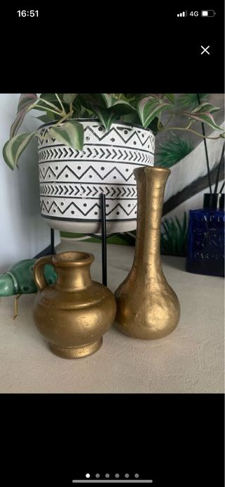 Set di due vasi decorativi in finitura dorata. Perfetti per aggiungere un tocco di eleganza. -ottone puro -sono abbastanza pesanti -vasetti decorativi per scrivanie o vetrine -mai usati ,come nuovi - Vaso con manico - Vaso alto e sottile