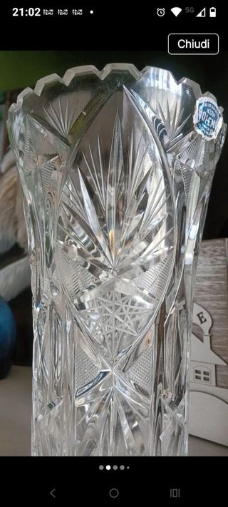 Elegante vaso in cristallo con un design finemente lavorato. Perfetto per aggiungere un tocco di classe alla tua casa. - Decorazioni intagliate a rilievo. - Base solida e stabile. - Bordo sagomato.